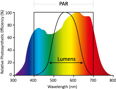 تشعشع های خورشیدی جذب شده برای فرآیند فتوسنتز در محدوده طول موج ۴۰۰-۷۰۰ نانومتر، یعنی طیف نور مرئی قرار دارند. این محدوده یک رنج بهینه ای است که برای موجودات زنده مضر نیست. طول موج های کوتاه تر به سلول ها آسیب می رساند و توسط لایه ازن فیلتر می شوند و همچنین طول موج های بلندتر انرژی کمتری برای انجام عمل فتوسنتز دارند(هرچه طول موج بیشتر، انرژی کمتر). پس PAR در محدوده طول موج ۴۰۰ [nm] تا ۷۰۰ [nm] قرار دارد. محدوده PAR برای رشد انواع گیاهان متفاوت است. گیاهان مختلف به مقادیر متفاوتی از نور نیاز دارند. به طور کلی، گیاهان نور خورشید را ترجیح می دهند، زیرا نور خورشید طیف کاملی از PAR را ارائه می دهد. با این حال باتوجه به تغییرات فصول، شرایط جغرافیایی و توجه به افزایش بهره وری محصول، نور مصنوعی بعنوان نور مکمل برای رشد گیاهان استفاده شود.در شکل ۲ محدوده طول موج قابل درک برای انسان (lumens) و قابل درک برای گیاهان (PAR) را مشاهده می کنید. در ادامه خواهید دید، نوری را که در محدوده زون PAR قرار دارد و روی محصول میافتد را اندازهگیری میکنیم و با شاخص PPFD یا چگالی شار فوتون فتوسنتزی که بر حسب میکرومول در هر متر در هر ثانیه ( μmool/s.m۲) بیان میشود، نشان می دهیم- تعاریف شاخص PPFD و سایر شاخص های مهم را در ادامه مشاهده خواهید کرد.