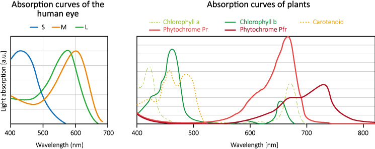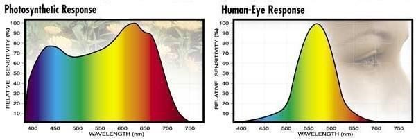 باتوجه به منحنی جذب نور توسط انسان و گیاه (شکل۳) شاهده می شود، گیاهان نور را در طول موج های آبی و قرمز به بهترین شکل ممکن جذب می کنند. به همین دلیل است که گیاهان اغلب سبز به نظر می رسند، زیرا نور سبز تنها نوری است که آنها جذب نمی کنند. از سوی دیگر، انسان نور را مانند گیاهان جذب نمی کند. انسان ها سلول های گیرنده نوری در چشمان خود دارند که به طول موج های مختلف نور حساس هستند. این سلول ها نور دریافتی خود را به سیگنال های الکتریکی تبدیل می کنند که به مغز ارسال می شود. مغز این سیگنال ها را به صورت رنگ تفسیر می کند. انسان ها می توانند نوری با طول موج های بین ۴۰۰ تا ۷۰۰ نانومتر را ببینند. این به عنوان طیف مرئی شناخته می شود.