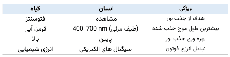 در اینجا جدولی وجود دارد که تفاوت های کلیدی بین جذب نور توسط گیاه و انسان را خلاصه می کند: